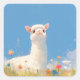 A charming white alpaca stands proudly in a field of colourful wildflowers, gazing upwards with an innocent and curious expression. The sky above is a brilliant shade of blue, with soft clouds drifting in the distance. The delicate flowers, in hues of orange, pink, white, and blue, sway gently in the warm breeze, adding to the peaceful and whimsical atmosphere. The alpaca's fluffy fur appears soft and well-groomed, making it the perfect representation of nature’s serenity and joy. This design captures the essence of a bright and cheerful countryside moment.