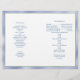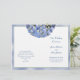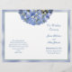Folded, blue hydrangea wedding program template. A big, blue hydrangea flower decorates the front and back (when folded) with dark, grey - blue template text. Use the example text placement to customise all four sides of this ceremony program for your event. Please DO Not change the paper type.