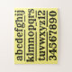 Child's educational jigsaw. A gift for a child to help them learn as they play. This jigsaw has a design that features the alphabet as well as numbers. Your child will learn as they enjoy putting the jigsaw together. Jigsaw with large pieces. A design featuring the alphabet and numbers in black on a yellow background. This is a good teaching aid for anyone working in education.