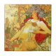 Alphonse Mucha Autumn tile. Oil on canvas from 1896. Czech artist Alphonse Mucha frequently did allegorical work depicting seasons. This particular version of Autumn is from a series painted in 1896 and feautures a beautiful young woman with dark red hair adorned with white chrysanthemums. She wears a thin blue dress and stand in a vineyard. In her left hand she holds a porcelain dish, and in her right she squeezes a fresh bunch of purple grapes still on the vine. A beautiful gift for fans of Alphonse Mucha, Art Nouveau, and allegorical paintings.