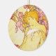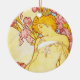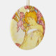 Alphonse Mucha Iris ornament. Oil painting on canvas. Czech painter Alphonse Mucha painted an allegorical series depicting various flowers as beautiful women. Iris features an attractive brunette wearing a thin dress. The woman is surrounded by giant purple irises that climb the yellow and blue background. A great gift for fans of Mucha, art nouveau, and allegorical flower paintings.