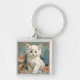 Keychain featuring a white cat in the style of Alphonse Mucha! This blue eyed fluffy kitten poses with pink flowers and blue blankets. A fabulous gift for cat lovers and Art Nouveau collectors!