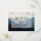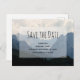 Save the date birthday, baby shower or other event postcard. Designed with a photograph of beautiful mountains, cloudy sky, and rolling hills filled with trees in the foreground. Grey blue colour scheme.