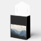 Wedding favour box with a photograph of beautiful mountains, cloudy sky, and rolling hills filled with trees in the foreground. Grey blue colour scheme.