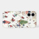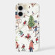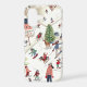 Festive phone case featuring a playful alpine ski lodge winter pattern with skiers, cabins, and snowy mountain scenery. Perfect for winter lovers and holiday aesthetics. Original artwork by Caroline Bonne Müller
