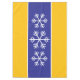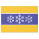 This festive winter holiday design features triple white Nordic snowflakes inside deep blue, white, and yellow orange stripes. The colours in this design can be personalised by editing the design.