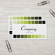 A stylish modern business/profile card template. Edged top and bottom with a row of nine round cornered squares going from a light green to black. Company details on the front with name and contact details on the back.
