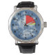 Not a real altimeter, the hands move clockwise, but the danger zone between the hours of midnight and 3 AM are highlighted in yellow and red for the night owls. Trendy altimeter clock face wrist watch over a blue sky background with clouds, calibrated for 12,000 feet of free fall for skydivers.