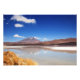 Photo print of a landscape with a snow-capped volcano reflected in a lake and yellow grass in the Atacama desert near Uyuni on the border between Bolivia and Chile on the high altitude of the Altiplano in the Andean mountains.