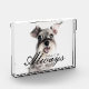 Cherish the wonderful memories forever with our custom pet memorial photo block. Our design features a full photo placeholder. Customize with your pet's name. "Always in our hearts" is displayed over the image.