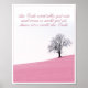 Einzelner Baum auf pinker Wiese mit blauem Himmel.