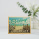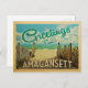 This Greetings From Amagansett vintage postcard design features a sandy beach with a beautiful turquoise ocean water and above the sea, a blue sky with billowy white clouds. In vintage travels style.