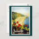 Vintage travel advertisement for Amalfi Italy, featuring their famous coastal roads which provides a very picturesque route for travelers. The gentle blue waters of the Sorrento peninsula can be seen with sail boats floating calmy on the waters. This image also shows the craggy mountains and the curving roads cut into the hillside which make this coastline so famous,