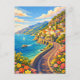 Capture the breathtaking scenery of southern Italy with this stunning Amalfi Coast design. This artistic illustration features a winding coastal highway overlooking a charming hillside village and the sparkling blue waters of the Mediterranean. With a foreground of vibrant spring flowers and a ferry cruising the coast, this piece perfectly evokes the warmth and beauty of an Italian summer. A perfect keepsake for travelers, Italy lovers, and fans of coastal European charm.