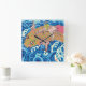 a girl rides on big carp who swimming up a big waves.