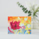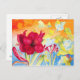 Amaryllis Morning Glories Postcard. This colourful card depicts a spray of Red Amaryllis and Morning Glories on an orange and blue background.