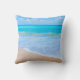 A square pillow with a photograph of a clear blue ocean scene with gentle waves along a seashore and soft brown sand. A blue sky with fluffy clouds off in the distance. Serene tropical idyllic seascape.