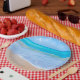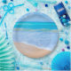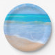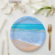 Paper plates with a photograph of a clear blue ocean scene with gentle waves along a seashore and soft brown sand. A blue sky with fluffy clouds off in the distance. Serene tropical idyllic seascape.
