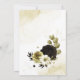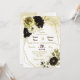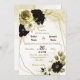 Beautiful botanical wedding invitation featuring brown, ivory white and gold flowers with gold leaves on a gold geometric frame.