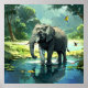 Amazing Elephant in River with Birds Painting Poster