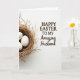 Designed with a calm, intimate Easter mood, the image features a carefully woven bird’s nest tucked into the upper left area, made from thin twigs and straw-like strands. Inside sit three smooth eggs with light brown speckles, close together as if sharing a quiet, affectionate moment. Soft, diffused lighting warms the eggs and nest, creating gentle shadows that add depth without crowding the scene. The background is a wide, plain white space that keeps the focus on the natural textures and the closeness of the objects. To the right, dark brown text reads “HAPPY EASTER TO MY Amazing Husband,” with “HAPPY EASTER TO MY” set in a sturdy serif style and “Amazing Husband” in a flowing cursive look. The lettering sits in the open space beside the nest, balanced so the message feels like it’s leaning toward the eggs in a tender, companionable way 🌷. The nest’s twig edges curl outward slightly, and the three speckled eggs rest snugly at the center 🐰.