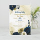 Beautiful navy blue ivory white and gold flowers with gold leaves birthday party invitation.