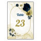 Beautiful navy blue ivory white and gold flowers with gold leaves table number card.