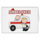 Two stick figure EMTs and an ambulance with text that reads "AMBULANCE" on Ambulance T-shirts, bodysuits, mugs, magnets, tote bags, stickers, and other firefighter clothing and gifts.
