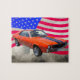Classic orange 1969 AMC Javlin muscle car photo with American Flag background.