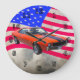 Classic orange 1969 AMC Javlin muscle car photo with American Flag background.