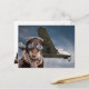 Another cute photo in the anthropomorphic postcard series: The Adventures of Ally, The Australian Kelpie dog. Here she is at the busy airstrip, and an A79-109 aircraft is flying overhead. She's dressed as Amelia Earhart, the aviator, wearing a scarf, hat, and goggles. Don't get lost Ally! Photographer: Louise Docker