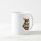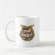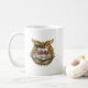 This artistic image features a faux "yellow metal" badge with the American eagle, shield, flag and the text "The land of the brave", "776 USA 2026". A unique, one-of-a kind patriotic gift for anyone, charm to celebrate the 250th America's birthday, the Independence Day, Fourth of July. A beautiful mug to drink tea or coffee.