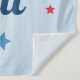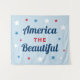 A bold America the Beautiful tapestry featuring striking red and blue typography accented by scattered patriotic stars on a light blue background. Ideal as a Fourth of July party photo backdrop, patriotic wall hanging, or Independence Day celebration decor. All text is fully customizable.