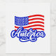 Illustration of the word "America" in a stylised script font, with a waving American Flag above it! The word "America" is rendered in a deep blue colour with a lighter blue outline, giving it a three-dimensional effect. Below the word, there's a row of small white stars, echoing the stars on the flag. The American flag is depicted with red and white stripes and a blue canton filled with white stars. The overall style is clean and graphic, with a patriotic themed.