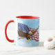 Show your patriotic side with this white and red 11 oz. combo mug with an image, on both sides, of a waving American flag and a bald eagle in flight on a cloudy blue sky. See matching candy jar, paper plate, square ceramic tile and coasters. See the entire Independence Day Charm Mug collection under the HOME category in the HOLIDAYS section.