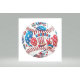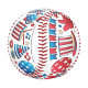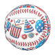 A baseball with red stitching and patriotic designs, including stars, stripes, a drum, a party hat, sunglasses, and musical notes, all in red, white, and blue.