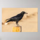 A photograph shows a crow perched atop a weathered wooden post. The crow is facing right, with a small, round object held in its beak. The bird's feathers appear smooth and detailed, contrasting with the rough texture of the post. The background is a soft, blurred grey, suggesting an outdoor setting.