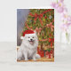 This Christmas card features a watercolor portrait of an American Eskimo Dog a Santa hat sitting under a Christmas tree.