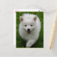 Aww...who can resist the sweet face of a happy Eskie pup? This fun blank postcard features a happy white American Eskimo puppy dog playing in the tall green grass