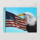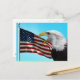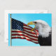 Photograph of an American flag waving against blue skies and a bald eagle calling.