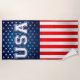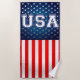 This patriotic beach towel inspired by the American flag, features alternating red & white stripes, 50 silver stars set on a blue background, and the letters USA in the middle.