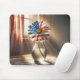 Sunlight streams through a window, illuminating a daisy with petals patterned after the American flag, positioned in a clear vase atop a table with a lace doily