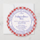Your 4th of July picnic will feel even more special with this simple patriotic design of red white and blue. It is a graphic design of a furling American flag displayed on the centre back encircled by red and white gingham checks. The details are in the centre front With text templates to make it easy to fill in the fun details for the party of the year. The round-circular shape has text arched on the top and bottom. The templates are very intuitive and easy to personalise.