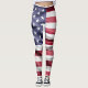 A woman's legs are shown from the waist down, wearing leggings with the American flag design. The left leg features the blue field with white stars, while the right leg displays the red and white stripes. She is wearing black and white sneakers. The background is a plain, light grey colour.