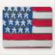 A wooden pallet is painted to resemble the American flag, featuring red and white stripes alongside a blue section with white stars
