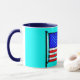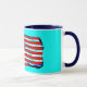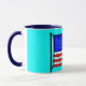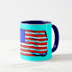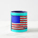 This pretty mug features my original photograph of the United States of America Flag, styled in an illustrated and pop-art technique for an artsy appearance on an aqua blue background. The handle and inside of the cup are a dark blue tone to complement the artwork.