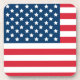 Patriotic drink coaster features an American flag design with stars and stripes in red, white, and navy blue colours.