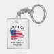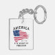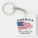 Fun classy patriotic keychain with cool red, white and blue American flag pattern design and AMERICA THE SPIRIT OF FREEDOM EST. 1776 text in classic typography lettering.