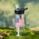 Carry your American pride with you wherever you go with the **American Flag CamelBak 20 oz**. This clear CamelBak features a striking design of the American flag in bold red, white, and blue. The flag's stars and stripes stand out brilliantly against the clear backdrop, making a strong statement about your love for the USA. Imagine yourself hiking through national parks, attending patriotic parades, or just staying hydrated at the gym—all while proudly displaying the symbol of freedom and unity. The design not only celebrates the spirit of America but also serves as a daily reminder of the values we hold dear. Made from durable materials, this CamelBak is equipped with a spill-proof cap and a convenient straw for easy sipping. It's perfect for anyone who loves to combine functionality with a touch of national pride.