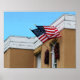 Two American flags flutter in the breeze on an adobe house in Old Town Albuquerque, New Mexico. Below are a pair of ristas, made of dried red chilli peppers.